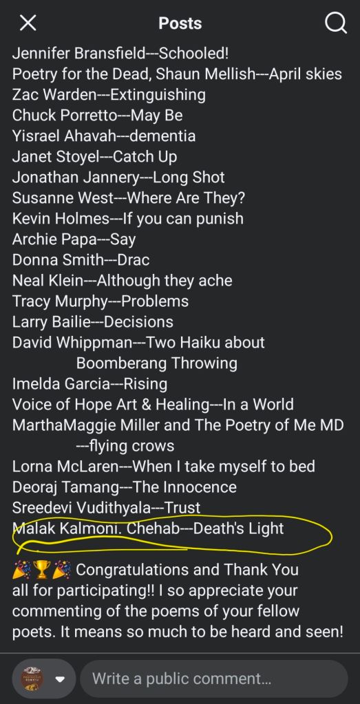 Malak Kalmoni. Chehab Beautiful mirroring poem, Malak, contrasting darkness and light like matter/antimatter images. Each stanza swells, expands and then contracts, like a realization of an important truth, an insight. The first is a powerful trip through the shadows of death, the dominion of the devil and the damned. The second stanza is a heavenly reprieve, a victory over destroying deviltry. Creatiing these two realms, your images are fantastic, original and elegantly presented. Excellent, dramatic poem!! By Linda Powers O’Dell