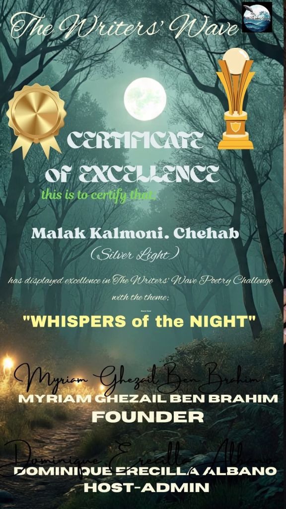 “Silver Light” by Malak Kalmoni Chehab is a poem that fits the theme “Whispers of the Night”. The poem explores the quiet, mystical atmosphere of the night, where the silver light of the moon shines bright, bringing hope and faith to the darkness.