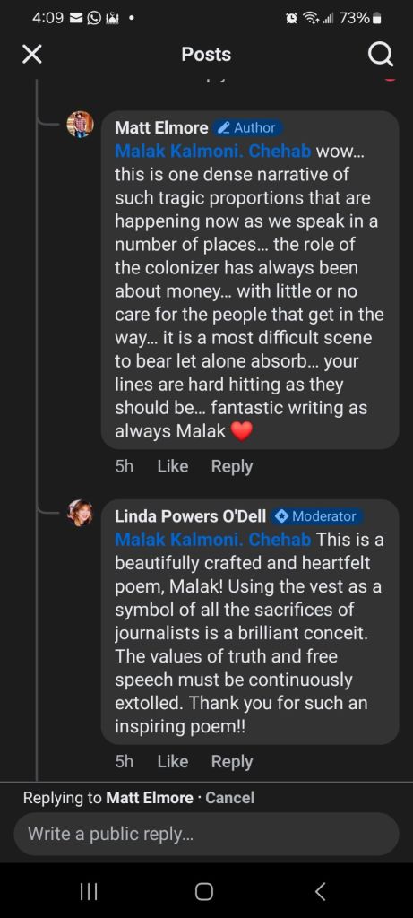 Malak Kalmoni. Chehab If your role model was THE VEST…. Much needed when successfully used. You sure wrote a provoking image-filled disturbing truth, sad to say, poem, Malak. Makes one know one life should MEAN TO ONE ANOTHER! ✝️☮️