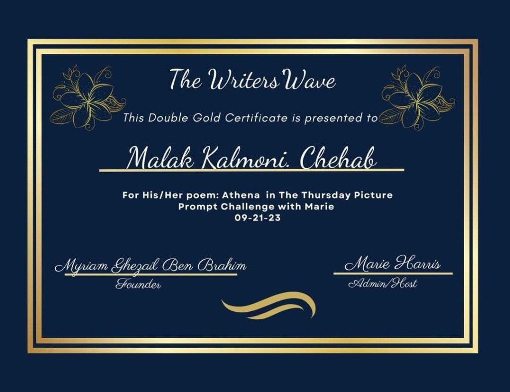 I’m flabbergasted by the honor of this certificate for my poem: Athena, based on a picture prompt.