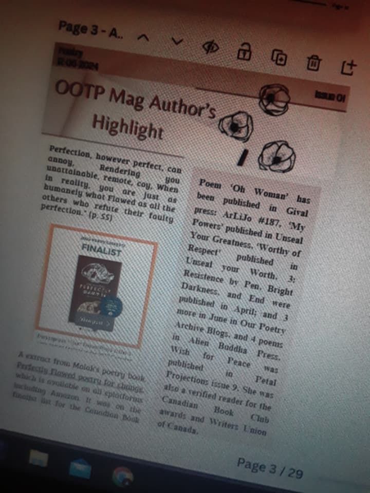 My poetry book, Perfectly Flawed poetry for change, is available on all eplatforms including Amazon. It was on the finalist list for the Canadian Book Club Awards 2023.