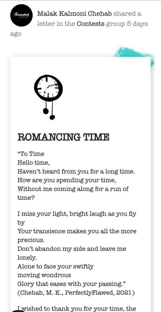 Enclosed please find the link to my letter to time, part of the Unsealed contest, it’s published there. Interestingly, the beginning of the letter is an exert poem from my poetry book, Perfectly Flawed , titled: To Time.