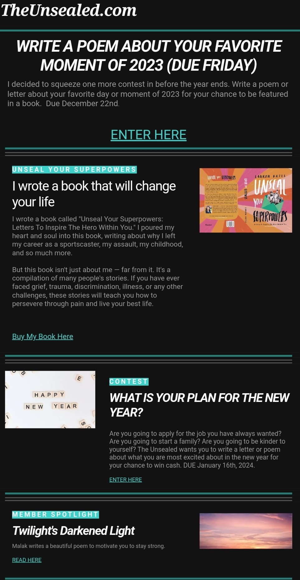 The online magazine, the Unsealed, has placed my poem, Twilight’s Darkened Light, in its newsletter! I’m so excited