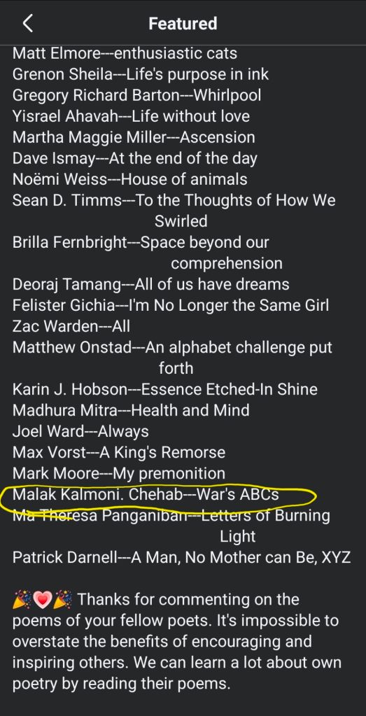 Malak Kalmoni. Chehab Wow, Malak, congratulations on such a powerful, historical poem! The state oppressing the people is an ages old story, but you make it come completely and authentically alive. Your images are quite extraordinary, beautiful in their precision and force. Gut-wrenching and heart breaking, this amazing poem speaks to the pain of cruel injustice. I believe this is an extremely important poem and should be widely read wherever apartheid held or is holding sway, wherever its effects are still felt. Bravo!!! 👏👏👏 by: Linda Powers O’Dell