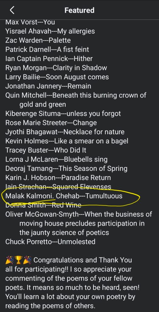 Malak Kalmoni. Chehab Excellent acrostic poem, Malak, replete with the most heartbreaking images! The violence, the grief, the blood and death are all so vividly portrayed. Your tone is courageously sincere, and your descriptions are balanced and authentic. Those poor orphans whose trauma is endless! Poetically this is a most poignant ending. Superb poem, thank you so much for sharing it. By Linda Powers O’Dell